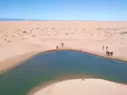 The beautiful lakes scattered in the vast desert, from the perspective of aerial photography, are like nature's overturned palette, breathtakingly beautiful, with yellow sand, lakes, and oases perfectly blending into a magnificent natural landscape.