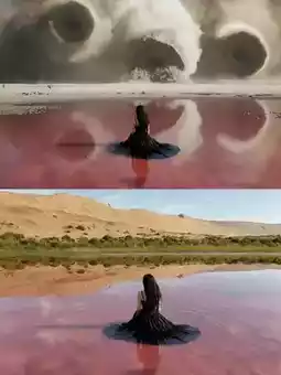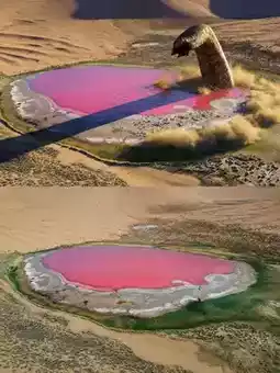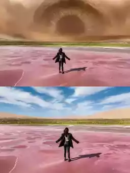 Earlier, a friend who crossed the Badain Jaran Desert for 3 days and 2 nights used AI to edit a photo for her: a giant sandworm bursting through the rolling sandstorm, creating an intense sense of pressure 🌪️ Paired with the naturally pink-toned surface of Red Sea Lake, it’s both dreamy and stunning 🤯 This friend really knows how to have fun!