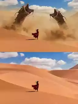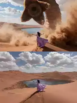✅ Upload to AI image generation platform + input command: keep background and subject unchanged, generate the sandworm monster from the movie "Dune 2" in the distance, creating a breathtaking apocalyptic desert scene filled with yellow sand