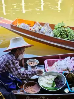 Tha Kha Floating Market is a morning market (mostly open on Saturdays, Sundays, and important lunar holidays), offering a chance to experience the freshness of the food and products, as well as the liveliness of the locals early in the morning. Paddling along the Tha Kha canals, meandering through coconut groves, offers a close-up glimpse into the locals' slow-paced lifestyle, while still offering a peaceful and tranquil atmosphere.