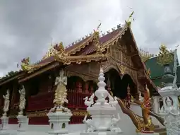 ..The golden wooden chapel is a combination of Tai Yai and Lanna art. The ceiling is in Traibhumi and Pali styles in the shape of a swan.