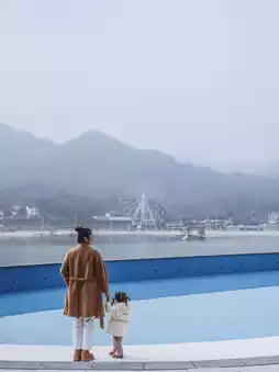 The hotel has a children's playground, perfect for little ones. The lakeside scenery is beautiful and great for a stroll with the kids. The rooms are huge, we stayed in a family room with 180-degree floor-to-ceiling windows, and the kids could run around freely. You can also watch the sunset in the evening. 🌅