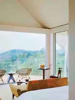 The room uses large floor-to-ceiling windows to achieve zero-obstruction contact between people and nature.