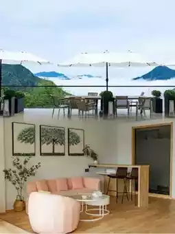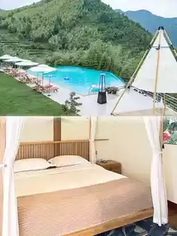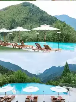 🍅 The pool is built halfway up or on top of the mountain at an altitude of 900 meters, surrounded by mountains and lush bamboo forests, with clear water. The pool is uniquely designed as an infinity pool, with lounge chairs and an outdoor shower area on the side.