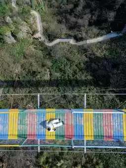 A rainbow-colored sky bridge offering beautiful overlooking views, also perfect for taking photos.