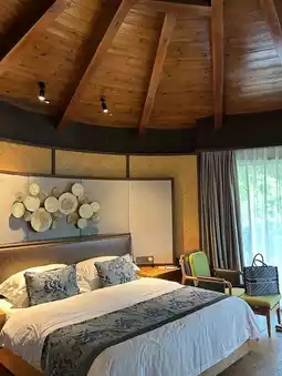The environment is great, with standard suites and detached thatched cottages. We chose a detached thatched cottage, and the hotel offered several free activities, including a Hanfu experience and a Wupeng boat ride. There's also a free shuttle service, and meals can be delivered to your room. Although it's a bit far from everything, it's generally quite convenient.