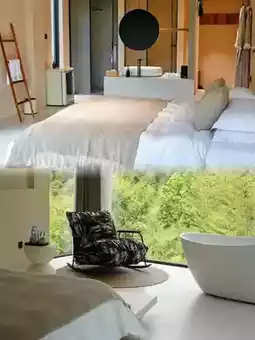 The hotel is a five-story white building with a modern and simple appearance, full of European style, and perfectly integrated with the surrounding green mountains and rivers. The super wide-angle viewing terrace on the top floor allows you to directly face the endless bamboo sea, as if you are in a green ocean.