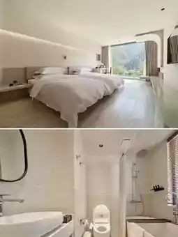Hidden on a hillside amidst the bamboo sea of northern Zhejiang, Shan'an Shenxi sits at an altitude of 500 meters, commanding a panoramic view of lush mountains. Open the window to see waves of bamboo, listen to the murmuring streams, and gaze upon the swirling clouds below, as if stepping into the mystical martial arts world of "Crouching Tiger, Hidden Dragon." A 280-meter walk leads to the Shenxi Big Stone Wave, and a 5-minute drive takes you to the Northern Zhejiang Grand Canyon, making it the perfect escape from the hustle and bustle of city life.
