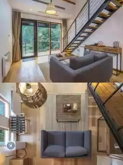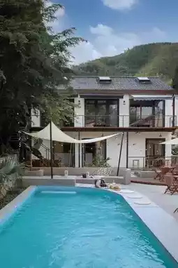 Wind along the mountain roads into this hidden paradise, past shimmering pools, where three cozy cottages stand quietly halfway up the slope, as if whispering their own stories.