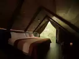 Nestled deep within a bamboo forest, the wooden cabin appears modest from afar, partially hidden among the trees. But as you approach, you realize it’s a two-story wonder—a magical childhood treehouse brought to life.
