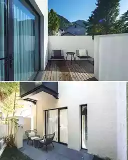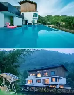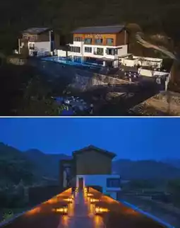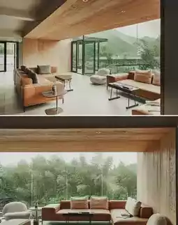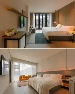 The homestay consists of three modern buildings combining natural wood and white, staggered along the mountain creek terrain. Buildings 1 and 2 are connected by a sky bridge over the creek, with cantilevered terraces blending into the bamboo creek scenery. Building 3 stands independently against the mountain, rebellious yet Zen-inspired. The lobby’s floor-to-ceiling windows face the pool and bamboo sea, with a pure white backdrop, wooden bar, and green plants, perfectly blending Nordic minimalism with mountain wilderness spirit.