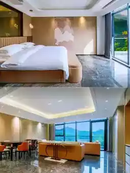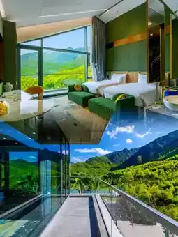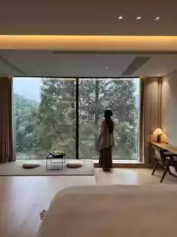 There are 202 panoramic rooms, all with floor-to-ceiling windows and viewing terraces overlooking the lake, mountains, and bamboo sea. Unique room types include "Lan Shan Room," "Qing Miao Room," and "Yi Zhu Room."