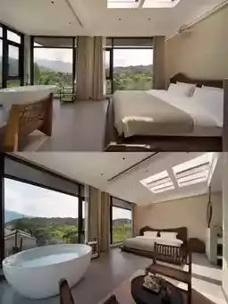✨ The rooms are designed in a wabi-sabi style, with floor-to-ceiling windows overlooking layers of green. Waking up to birdsong in the morning, you can often see mist drifting over the mountain peaks—truly living inside an ink painting! With underfloor heating and a bathtub by the window, soaking while watching the mountain haze drift by makes even your pores take a deep breath~