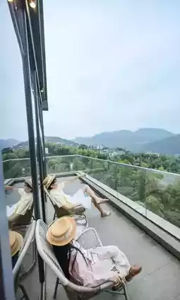 We stayed at Yunshang Grassland Resort · Banshan Yin Zhu Hotel, located at the cable car ticket gate, making it very convenient to visit Yunshang Grassland. The moment you open the door, the spacious and elegant villa-like atmosphere greets you. The room features a low-saturation green base color, exuding a sense of light luxury and exquisite detail while feeling relaxed and homey. Large floor-to-ceiling windows bring the endless bamboo sea outside fully into the room. When the morning light streams in, bamboo shadows gently sway on the textured carpet, and even the hanging linen curtains are tinged with a faint green hue. The view here is excellent, and there’s a terrace where you can watch the sunrise and sunset 🌅.