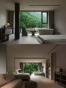 Design style: Multiple houses built along the mountain, with exterior walls combining rammed earth and natural wood, featuring clean lines ๐, blending seamlessly with the mountain terrain. The interior combines wabi-sabi, new Chinese style, and modern aesthetics, with large floor-to-ceiling windows bringing the outdoor bamboo sea scenery indoors ๐ก