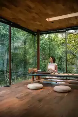 Sunlight filters through bamboo leaves in the afternoon, and at night you can gaze at the starry sky.