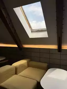 The interior has a warm wood-toned interior and large windows that let in sunlight, making it feel like you're in the middle of a real forest.
