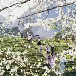 Pingba is planted with white early cherry blossoms, pink late cherry blossoms, and a large tea garden. As the breeze blows, cherry blossoms fall down. Standing among them is like walking into a super romantic anime scene. The scent of tea mixed with the scent of flowers makes people feel particularly comfortable.