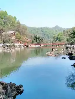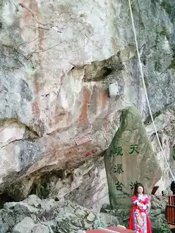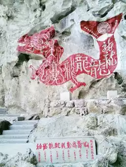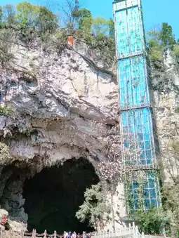 The exterior scenery of the Dragon Palace is magnificent, with majestic mountain formations and deep karst caves. The cave entrance resembles a giant mouth, flanked by a transparent sightseeing elevator that soars straight into the clouds. On the rock walls, vermilion dragon-shaped reliefs and carved stones appear ancient and vigorous, reflecting the profound heritage of dragon culture. At the foot of the mountain lies a natural pond with emerald-green, serene waters, where waterfalls cascade and water and rocks complement each other, creating a delightful view. The surrounding vegetation is lush, adorned with light purple flowers, adding a touch of soft beauty to this karst wonder.