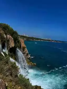 Düden Waterfalls, located just outside Antalya, are a stunning natural attraction where the Düden River cascades dramatically into the Mediterranean. The site features two main sections: the Upper Düden Waterfalls, surrounded by lush greenery and picnic areas, and the Lower Düden Waterfalls, which plunge directly into the sea, creating a breathtaking view.