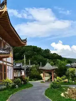 🏞️ Visit the Changbai Mountain Baihua Valley Korean Ancient Village, where you can admire the simple and tranquil scenery of the ancient Korean village and taste the delicious Ginseng Chicken Soup.