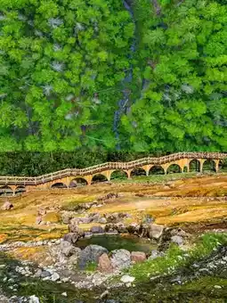 The Julong Volcano Hot Spring Group is filled with steam; reach out to feel the warmth of the hand bath pool, then take a bite of the special hot spring egg, with tender egg white and solidified yolk—delicious beyond words. Green Abyss Pool is like a poetic painting, with emerald water and a 26-meter waterfall. In summer, the mist creates a fairyland atmosphere; in autumn, the colorful forest reflects in the pool, so beautiful you can’t look away. In the valley forest, wooden plank paths wind deep inside. Strolling here, surrounded by ancient trees and moss, full of negative oxygen ions, it’s the perfect place to relax your body and mind.