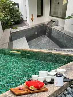 The hotel is located in Anxi, Quanzhou, which is famous for its hot springs. After checking in, I booked an outdoor hot spring bath. It's a large hot spring pool, and the staff will make tea for you to drink while you soak. The bedding is also very comfortable. The hotel also offers aromatherapy services, and you can choose the scent for your room or house. We chose a tea scent because Anxi is also home to a famous tea factory. We also chose a tea scent for the pillows and bath bombs, which helped us sleep well.