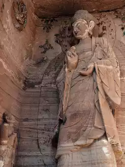 The statues are mainly from the Tang Dynasty, Five Dynasties, and Song Dynasty. Because the Yuanjue Cave inside was very famous in those years, it was named after it. But very ironically, in that special era, the heads of the Twelve Yuanjue were artificially destroyed, and now they are all replacements, which is very sad.
