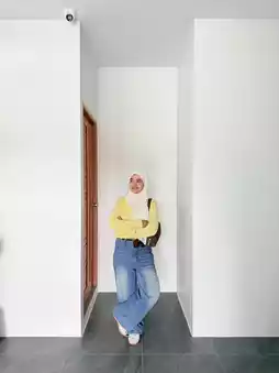 It is a minimalist white-toned cafe in the middle of a palm garden.