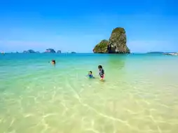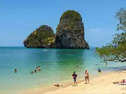 Ao Nang is located approximately 6 kilometers from Hat Noppharat Thara and 20 kilometers from the town of Krabi. A large bay with scenic beaches and 83 small islands, Ao Nang has several famous beaches which include East Rai Le, West Rai Le and Tham Phra Nang (cave) which stretches to the foot of a prominent limestone range. A boat from Ao Nang Village can be hired for sightseeing excursions around Ao Nang, Hat Tham Phra Nang and Hat Nam Mao, all of which are only accessible by foot. Other offshore isles such as Ko Poda, Ko Kai, Ko Mo and Ko Thap, are popular destinations that can be reached by a rented boat from Ao Nang. An abundance of colorful coral reefs and lovely cartoon fishes make these islands ideal for diving and snorkeling.