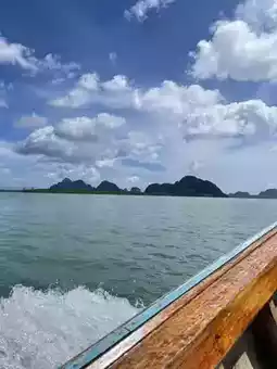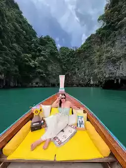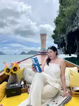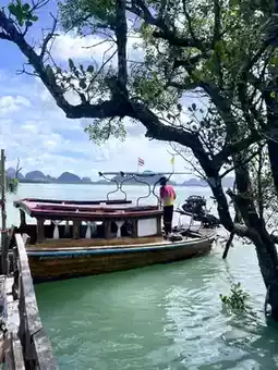 Charter a longtail boat with props set up on the bow for awesome photos to share on social media. There's also a photographer to take care of you and take photos throughout the trip. Splitting the cost between a friend and a few hundred baht per person. Today, my friend and I took a longtail boat from NAZMA TOUR. They offer several different itineraries. Today, we chose Program 2, chartering a boat for 3,000 baht and taking 2.5-4 hours. The trip will take you to: