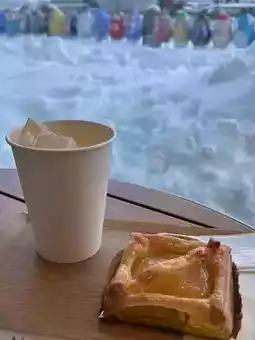 Walking along Aomori Port to A-FACTORY, it was exactly three o'clock in the afternoon. The sun shone through the thick clouds, and the reflections of the bridge and snow were reflected on the glass windows. I ordered a glass of apple juice and a piece of hot apple pie and sat by the window.