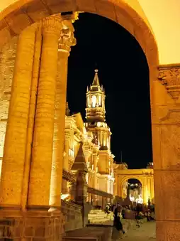 【Plaza de Armas】The Arequipa Cathedral and surrounding area are beautifully illuminated at night.