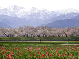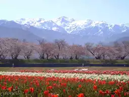 A one-of-a-kind cherry blossom viewing spot in Japan, with colorful tulip fields, yellow rape blossoms, rows of cherry blossom trees beyond, and the silvery Tateyama mountain range towering in the background