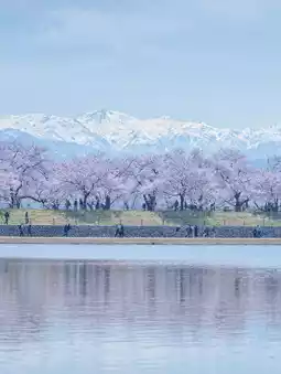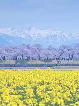 "Asahi Funagawa Spring Quartet" in Asahi Town, Toyama Prefecture is a spectacular spot where rows of cherry trees, tulips, and rape blossoms bloom with the snow-capped Mount Asahi and Mount Shirouma in the background.