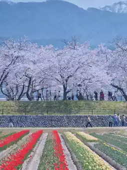 * The scenery of snow-capped mountains, pink cherry blossoms, colorful tulips, and yellow rape blossoms is truly spectacular!