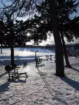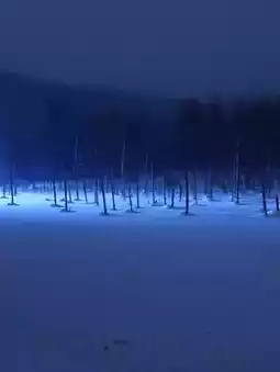 At around 7:00 PM, we went to the Blue Pond. The trees were covered in snow, and the area was illuminated beautifully, creating a romantic atmosphere.
