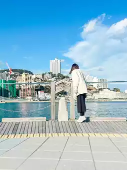 There are benches on the promenade "Moon Terrace" where you can relax while feeling the sea breeze. You can see Hatsushima and Izu Oshima, and it's especially spectacular on a clear day. *2nd photo