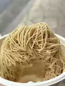 The dense and smooth chestnuts 🌰 are sweet but not greasy ☺️. Topped with a chestnut Mont Blanc, they're served with a crispy biscuit 🍪 ice cream 🍦. If you're looking to eat in, it's recommended to queue early.