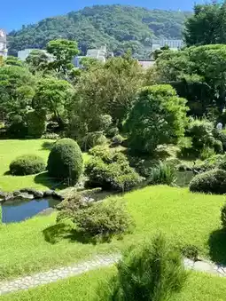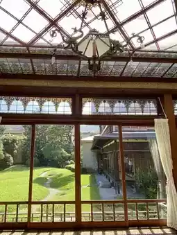 The interiors are a harmonious blend of Japanese and Western influences, with intricately designed rooms, stained glass windows, and ornate woodwork. The serene garden, with its manicured paths, koi ponds, and seasonal blooms, adds to the peaceful atmosphere—perfect for a slow, reflective stroll.