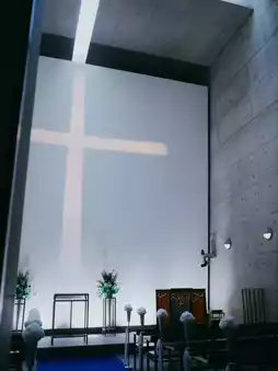 The exterior of the church is dominated by a simple concrete structure, with large glass windows that allow natural light to spill into the interior, creating a sacred and peaceful atmosphere🙏🏻✨