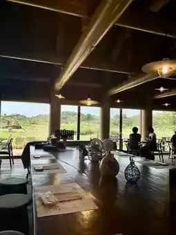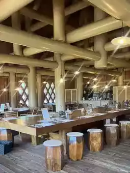 The spacious interior is designed with the warmth of wood, and the large windows offer views of the fields and the changing seasons, allowing for a relaxing atmosphere.