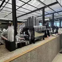 This cafe is like a huge warehouse, and features an open interior and strong sour coffee!