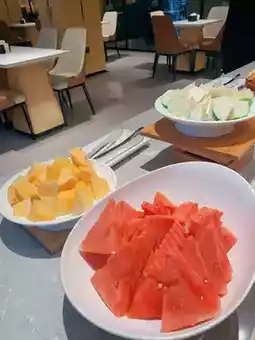 The hotel's breakfast was truly blissful! 🥰🥰🥰 The plate was overflowing with fresh fruit: juicy watermelon, sweet cantaloupe, and other fruits I can't name. Just looking at them was appetizing! ❗️