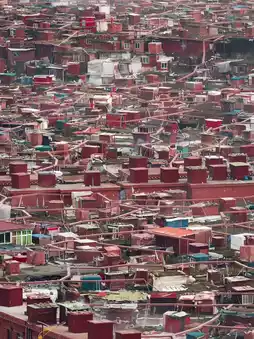 Ten thousand red houses fill the valley, like cinnabar pouring from the Buddha's fingertips