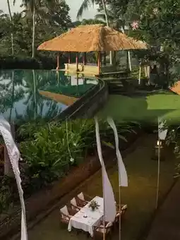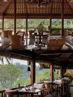 The open-air restaurant overlooks the pool and valley, where you can savor traditional Indonesian dishes made with fresh local produce, such as smoked duck and long bean salad—a true feast for the taste buds. Don’t miss the banana pancakes and refreshing cocktails at the pool bar.