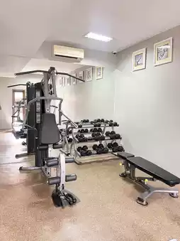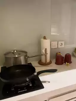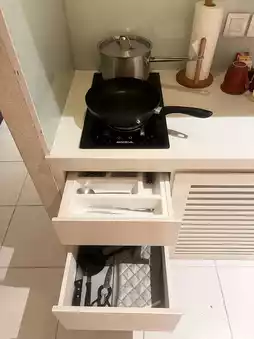 The room lighting was a bit dim, but it had a kitchen and microwave, and the room was spacious!