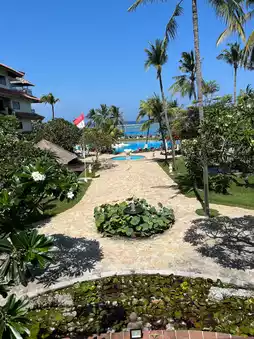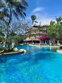 Stay in a sea view room and enjoy the stunning sea view and sunrise from the terrace every day 🌅. The bathroom is very spacious, with a separate bathtub. Enjoy the sunbeds by the pool, and the happy hour at Aloha Bar is particularly memorable. A short taxi ride will take you to Kuta and Legian. Breakfast and dinner offer a wide variety of delicious food, perfect for couples on their honeymoon 💑.