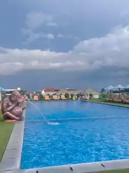 The pool is clean with few people, and you can see the streets of Bali and the sea! There’s a quirky fountain with water coming out of an animal’s mouth (lol)