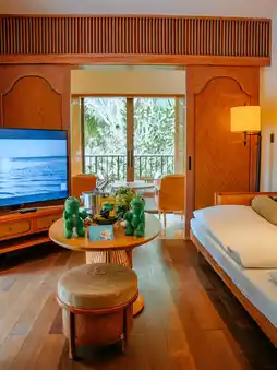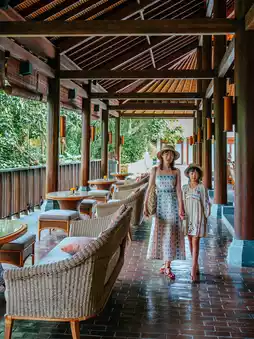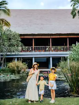 🛏️ The suite is very spacious, with a large sofa bed outside. The hotel thoughtfully prepared a welcome gift. Very comfortable for two adults and two children. The hotel has several pools where kids can play. The family pool water temperature is especially warm. There’s also a slide 🛝 and a warm water jacuzzi. Kids can enjoy water play without worrying about the rainy season. Bali-style stone statues are seen throughout the pool, adding lots of fun for the kids. The adult pool near the beach is great for taking beautiful photos. There’s also a kids’ club with staff accompanying the children throughout, organizing crafts and feeding ducklings.